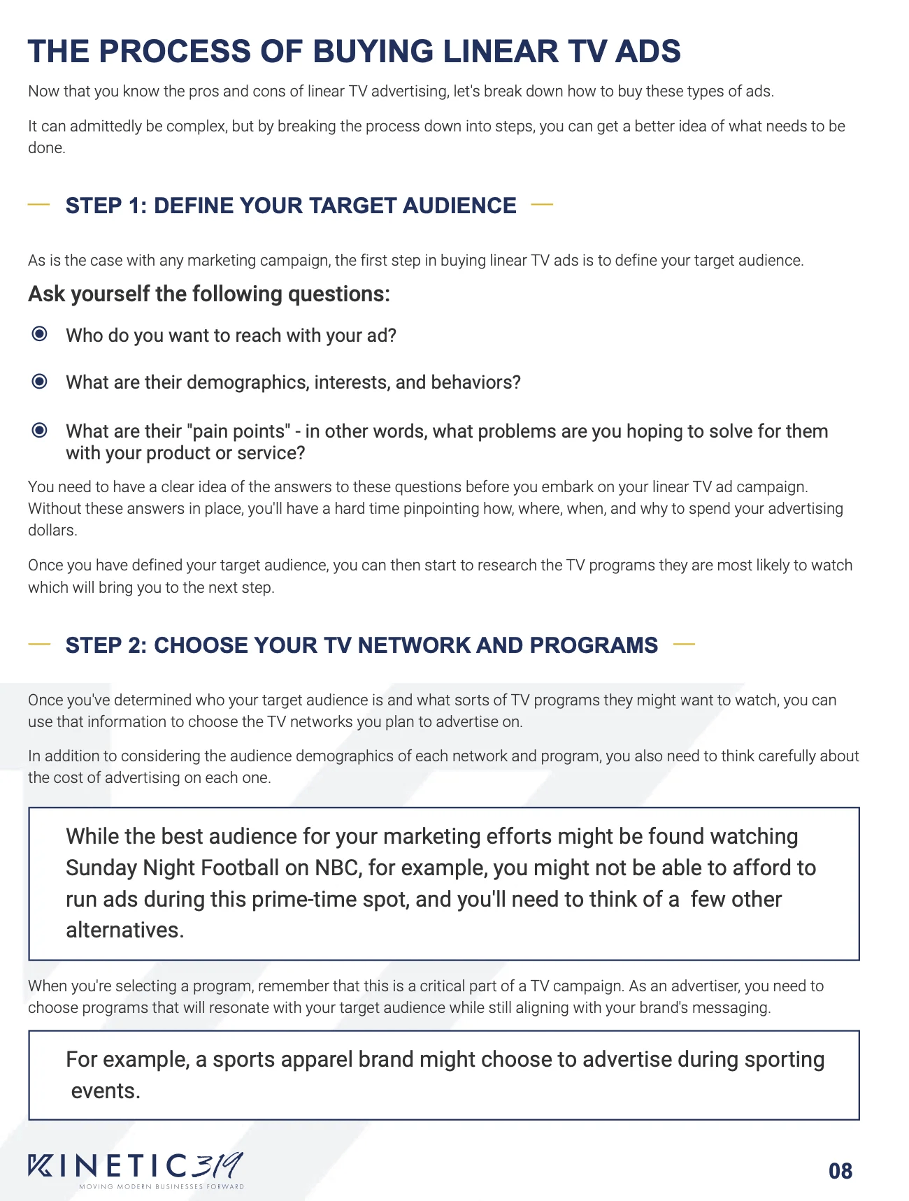 This eBook will provide marketers with an overview of linear TV ad buying in the United States. It will cover the advantages and disadvantages of the process, what that process actually looks like, and how you can measure the effectiveness of a linear TV ad campaign.
